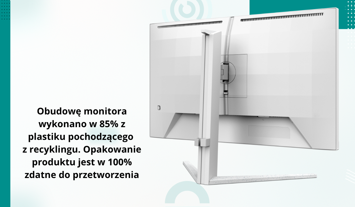 Philips Evnia 27M2N3501PA wyróżnia się również na tle konkurencji swoim przyjaznym dla środowiska designem. Obudowę monitora wykonano w 85% z plastiku pochodzącego z recyklingu. Opakowanie produktu jest w 100% zdatne do przetworzenia, co potwierdza zaangażowanie marki Philips w działania na rzecz środowiska.